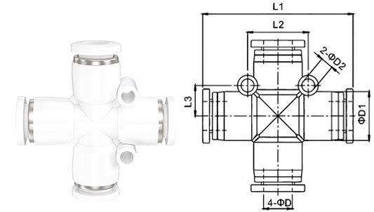 IPZ塑料四通十字型气管快插接头的技术参数: